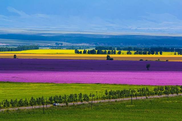 此时的昭苏大地,像一块明艳的“调色板”,一半黄一半紫。