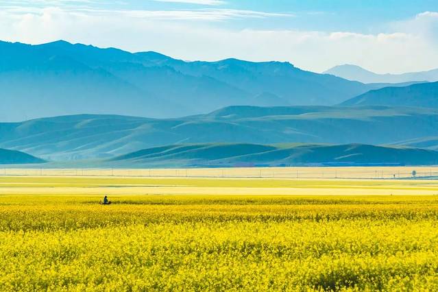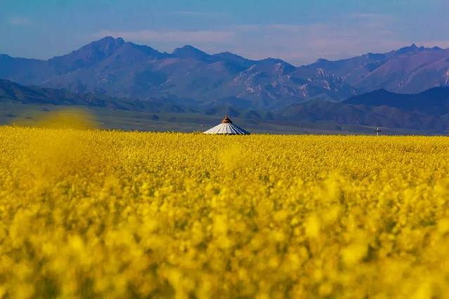 漫无边际的油菜花犹如一条条金色的织毯,席卷着广袤无垠的昭苏大草原。
