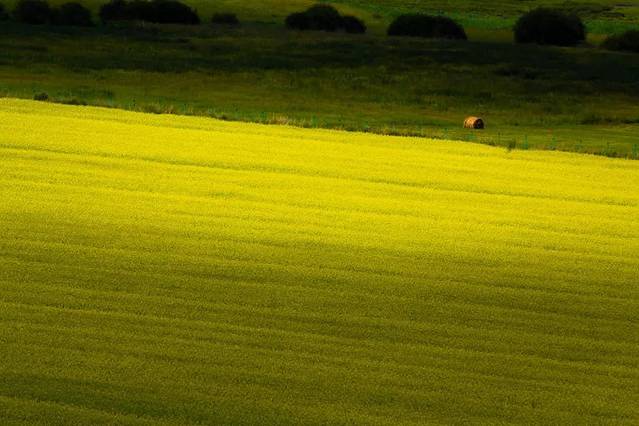 广袤的绿色背景上,大片大片黄灿灿的油菜花、向日葵花镶嵌其中,仿佛天幕上绘就的一幅巨大的油画。