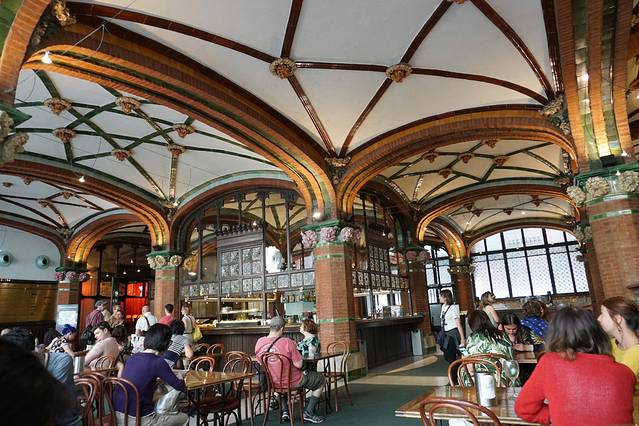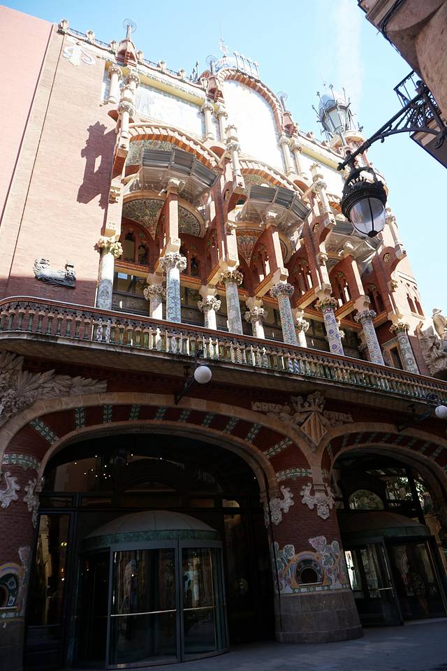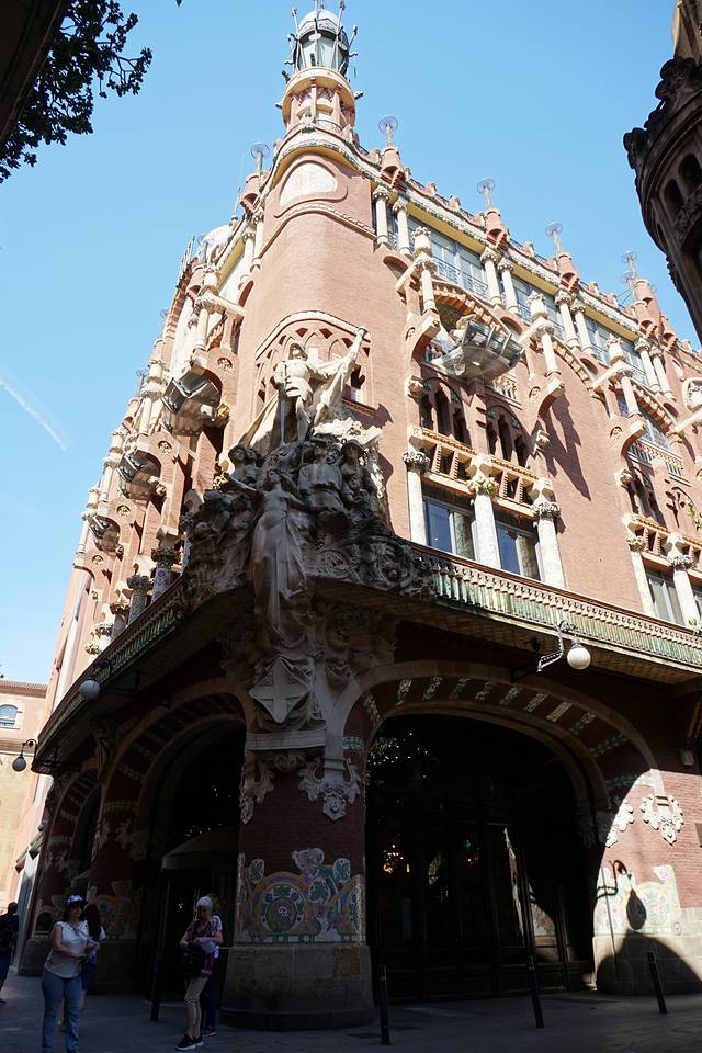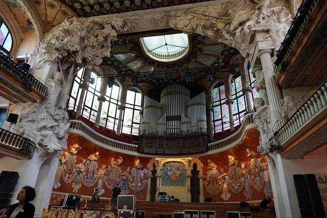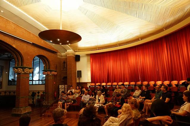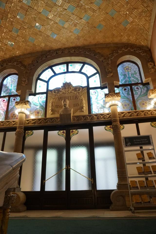 从加泰罗尼亚广场走大约五百米,就到了加泰罗尼亚音乐厅,在很窄小的街区里,窄到想找个位置拍个全景都没有。进去买票,分时间段开放不同语种的导览入场,有没有中文,最近一场是英文,将就吧。门票好像是10欧一人。