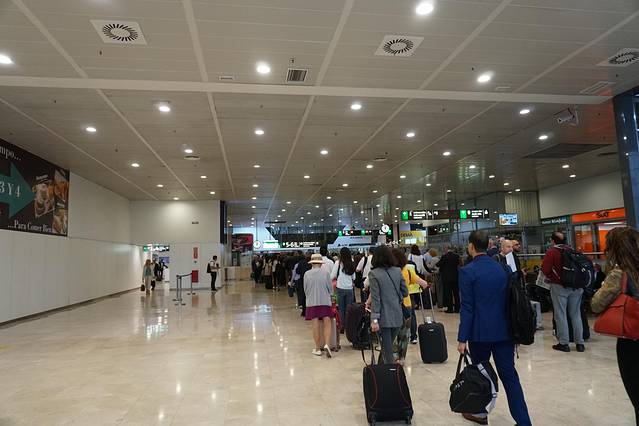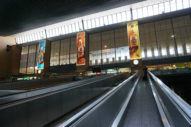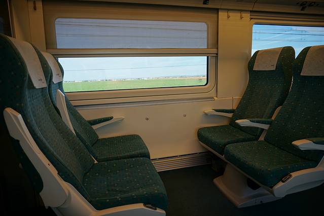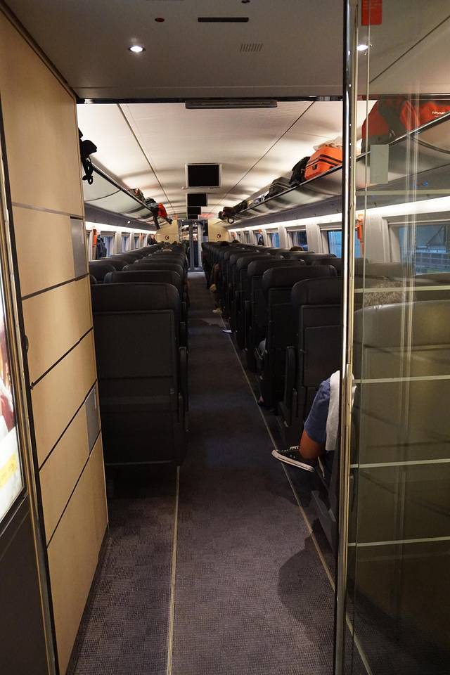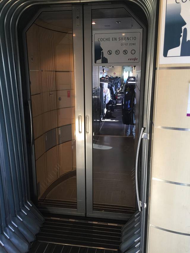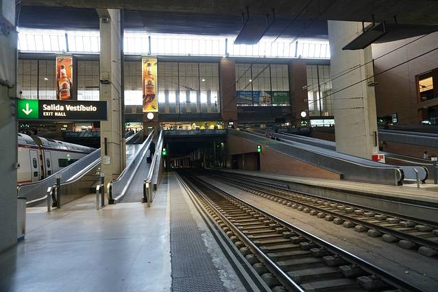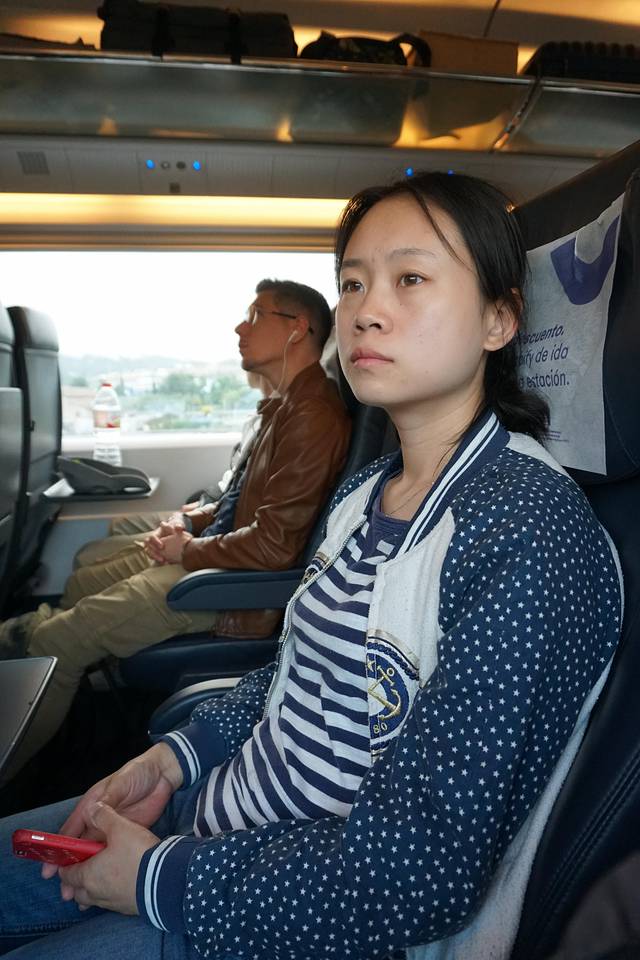 因为对于路程的预估时间不够,又出门晚了十分钟,走到了马德里车站里转了好几百米才来到安检口,几乎就要到了发车时间,安检的工作人员告诉我,你们的入口在楼上,然后看看我们的发车时间,还是让我们进去了,让我们进去再上楼吧,可是到了3号检票口,女的工作人员跟我们说必须要上二楼才能检票,可是要从里面上二楼只有过了检票门才能上二楼,所以她就是非要让我们出了安检再上楼,过安检再检票,然后再下楼到我们面前这趟火车上车,因为车马上就要开了,我恳求她让我们进去吧,但她非常坚决,而且那趟火车其实就在我们面前,过了面前的玻璃门就可以上车了,没办法,我们在候车厅转了一下,看看能不能找到别的楼梯可以上去,急得像热锅上的蚂蚁,但是还是没有找到,最后我们走到最边的1号门,那里门没关,也没有人在那守,我们直接走出了那道门,然后又跑回3号站台,就在这时,我们眼睁睁看着我们要坐的车开走了!当时真是无比崩溃!没有办法,我们就坐在站台上的凳子,打开手机,查后面的车票及时间,可是在网上能买的最近一趟车都要到下午了,而且这样临时买的车票价格比我提前买的优惠票价要贵两倍还多!我买的票是320一个人,当场买当天的最便宜的一个人700多,真是倒吸了好多口凉气,而且还要耽误大半天时间!就在这样紧急的情况下,我想起了当初买这趟车票时,前后还有蛮多趟车也是从马德里开到塞维利亚的,而且前后时间差距不大,并且依据从巴塞坐到马德里的经验,西班牙火车是进站检票,上车后和出站不检票,而现在我们已经到了站台,只要找到一趟开往塞维利亚的车,应该就可以了!跟老婆商量了一下,决定试试,就在这时,刚才检票口那个女工作人员看到了我们,然后和另一个工作人员讲了几句话后一起走向了我们,另一个工作人员问我们什么情况,我拿出车票告诉他我们在找我们的火车,他看了一下,告诉我们这趟车已经开走了,虽然买票时我看过我们买的这个价格的票规则是不能改车的,但我还是抱着希望的问他,我们还可以坐其他车吗?他再看了一下票,说不可以,你们只能出去重新买票了,听到这样说,我只能说好的,然后心想完蛋!可是说完,那两个工作人员也不管我们,就自己走回候车厅了,就在这时,我还是决定试试前面的计划,拉着老婆跑到了其他站台,走到第二个站台,看见车门上的显示屏写了Sevilla,车门敞开,然后我先走上车看了看,车厢很空,下车看了看前后没有乘务员,我就跟老婆一起把行李提上车了,放好行李我们找了两个位置坐下。