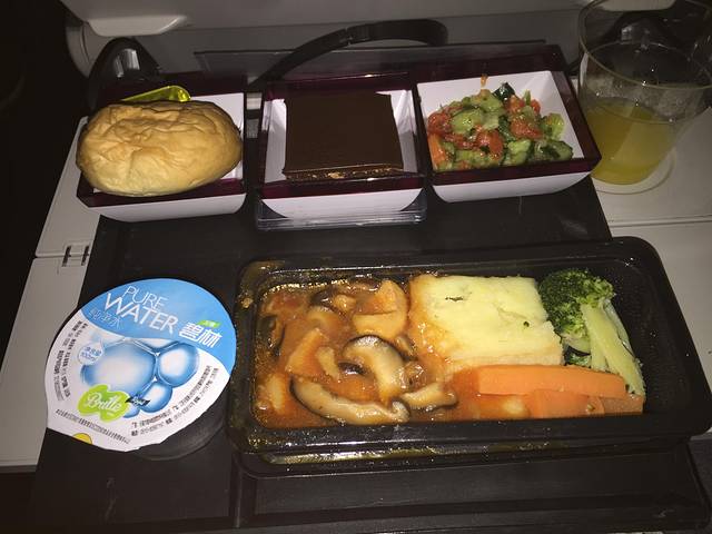 飞机起飞后空姐换装,每人发一份餐单,这一程一共两餐,一个正餐一个早餐,每餐有三种选择,还有饮料酒等选择。