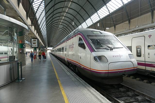 飞巴塞罗那是因为它在西班牙的东部,游览路线从这里开始一路向西,一直西到葡萄牙,不用走回头路,到时飞回巴塞就可以了。我是这样计划的,后期在确定具体行程时,因为发现在西班牙租车葡萄牙还车会有一笔很大的费用,所以还是决定多开两百多公里的回头路,回到西班牙还车,从塞维利亚飞回巴塞罗那。而如果不租车自驾,像法鲁、龙达、直布罗陀这些地方可能游览得很有限,或者说这些时间根本去不了那么多地方了。从巴塞至马德里,再到塞维利亚,这两段路程加起来有一千多公里,开车会浪费很多时间和精力,还是坐西班牙高铁Renfe吧,方便省时,虽然价格和国内动车比不便宜,我买的最便宜的打折票,第一段巴塞至马德里,差不多三个小时,400人民币一人,第二段,马德里至塞维利亚,两个半小时,330人民币一人。