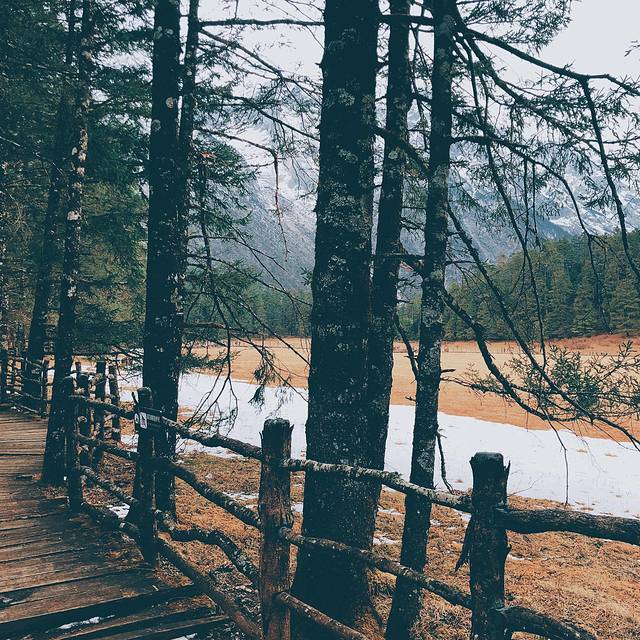 🏷️摄于云杉坪云杉林栈道 | 我们到达的前几天刚刚下过雪,还有残留的积雪在草坪和森林中