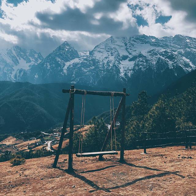 拍摄完蓝月谷我们跟着工作室的车一路上山,到达了一处他们自己搭建的取景地—帐篷。这里大概是在 玉龙雪山 的一处偏僻山麓,周围没有什么人非常安静。工作室也很用心的答了两个帐篷,旁边还搭了一个小的秋千。