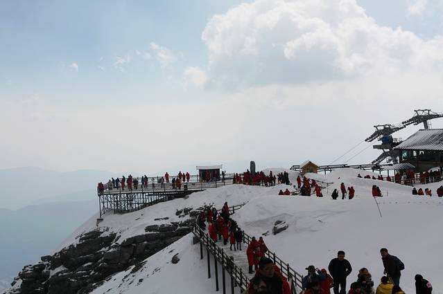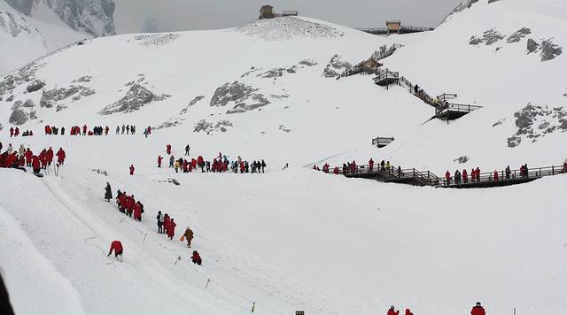 大玉龙要坐索道上山,一路冰雪景色,虽然是来自北方城市,可是这千年的冰川确实不多见的,这灰白色的冰川,沉寂了千年,在玉龙之巅。山顶有栈道,有种天之涯的感觉,海拔五千多,很有成就感。山顶有雪圈,作为一个东北人,我万万没想到我第一次坐雪圈是在玉龙雪山上,同行也不相信这点。徒步下栈道时间比较久,雪圈就不一样了,一群人坐在一串雪圈上,顺着山势而下,有种高速度的快感。害怕高反一直在补充高热的巧克力和牛肉干,不敢运动太猛,反应还不强烈。通票里的其他景点有些平淡,除了白沙古镇有壁画比较出名之外,其他几个人工景点趣味性要差了很多。