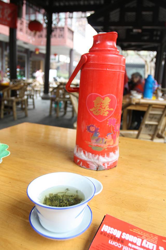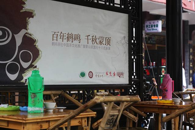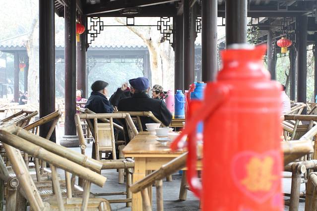 百年鹤鸣喝杯露天茶,春天还有些寒意,百年鹤鸣茶社里,人们一人抱着一个暖水瓶。