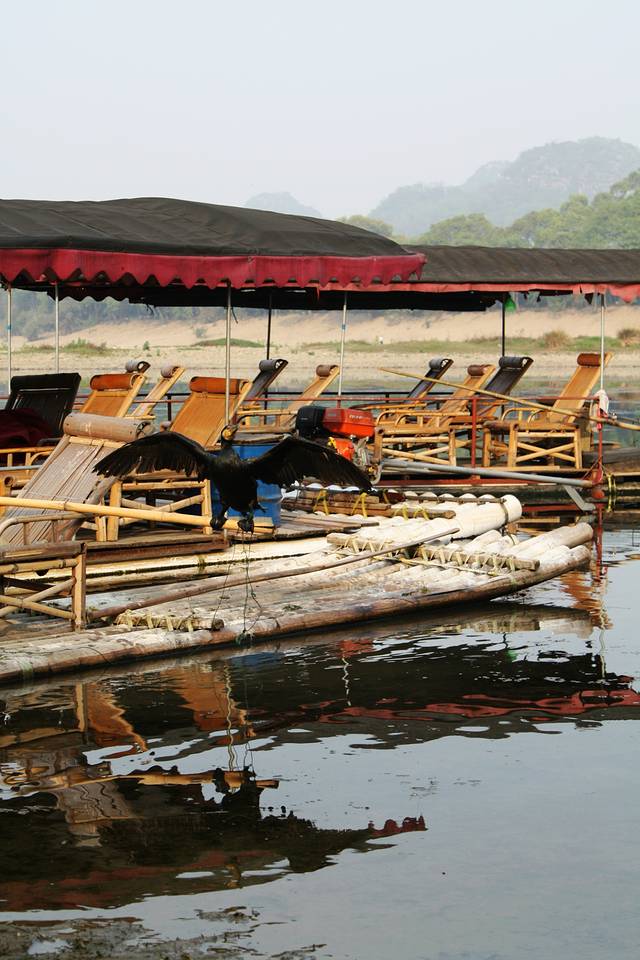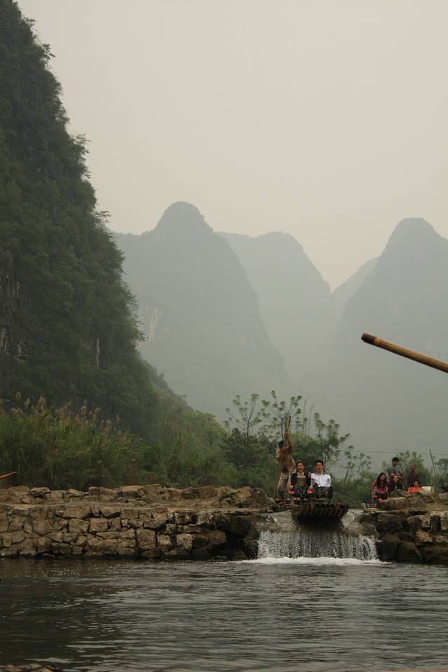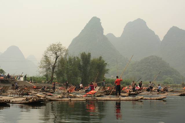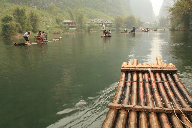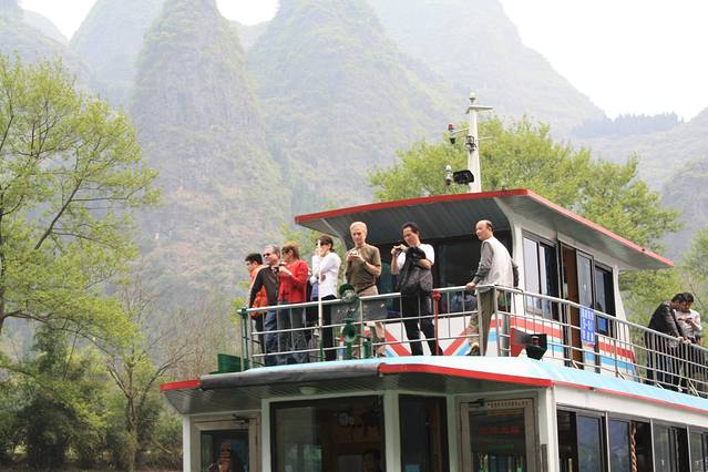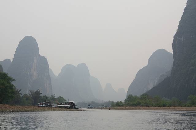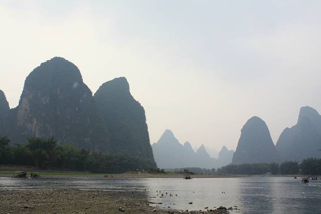 漓江坐摩托车到了坐船的地方,一眼就望见清澈的水,清的可以看到河底的石头,船行在漓江里,两岸山色很美,有人民币元背面的风景。