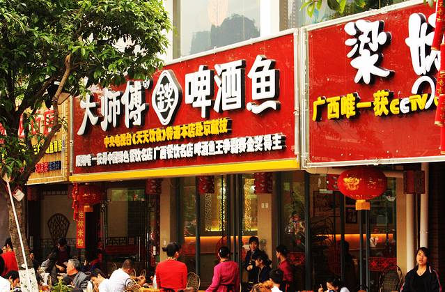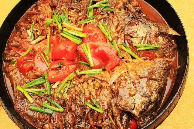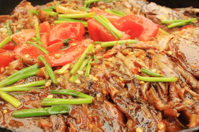 阳朔的特色是啤酒鱼,观察之后发现这家比较火。点了一条鱼自己吃,一斤八两,鱼鳞是保留的,加了许多番茄和啤酒,还加了铁盘加热,上面一层鱼肉比较嫩,下面一层的鱼肉因为加热比较久,所以很入味。