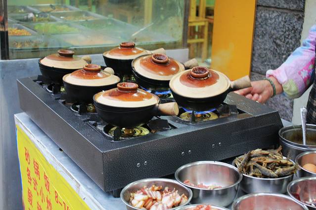 阳朔有许多砂锅饭,有的是可以选择菜品的,现场制作,砂锅做的米粉稍微会干一些,混合在一起味道还不错。