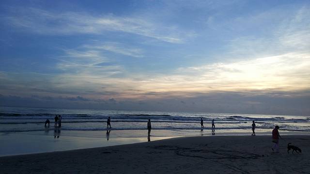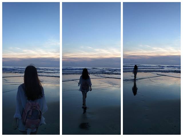 泛红的晚霞,粼粼的海面,靛蓝的沙滩……
