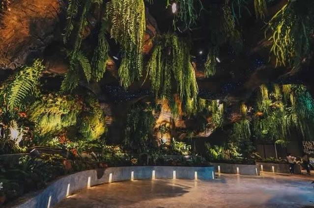 进入如洞穴般的花之影(Drift)主题花园则将让你体验到光影的魅力。变暗的空间使得植物丛间的灯光像萤火虫一样星星点点,两侧岩壁上展出着来自南美的兰花,配合着天花板上如帘幕般荡下的青葱蕨类,别具一番奇幻氛围。