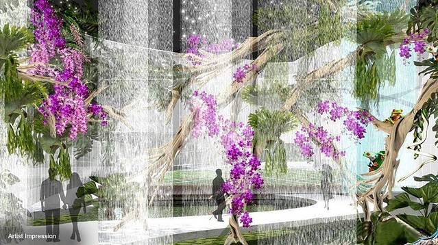 在雨林中漫步,听着瀑布倾泻而下的声音,伴着幽幽花香,忍不住要翩然起舞了。更神奇的是,还有水幕打印机,瀑布上会呈现出不同的图案!