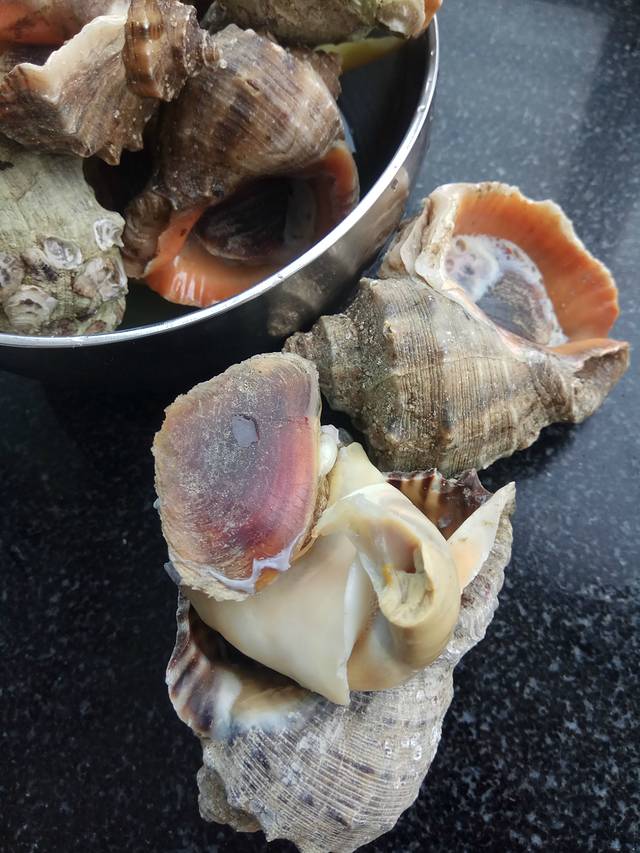 早市离住地百米距离。道路两边商贩们摆满了各种水果、蔬菜、海鲜、早点和小百货。我关注的重点是贝壳类海鲜、樱桃和早点。买了大小海螺、扇贝、芝麻螺、海虾和烤馒头,樱桃留给LP来买。回去在厨房加工后装饭盒中午吃。大海螺35元/斤,小海螺和芝麻螺都是20元/斤,扇贝5元/斤,海虾忘记了,烤馒头1元/个。现在是吃扇贝的季节,很肥美。这些海鲜我都是放点姜片直接水煮出来,不用放盐就有咸味,不仅鲜美还有甜甜的口感,非常好吃!烤馒头很好吃(忘记拍照了),可惜后面就再没买到过了。