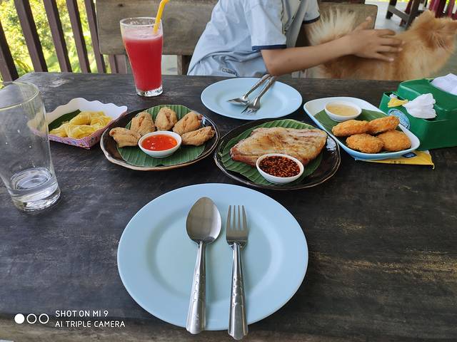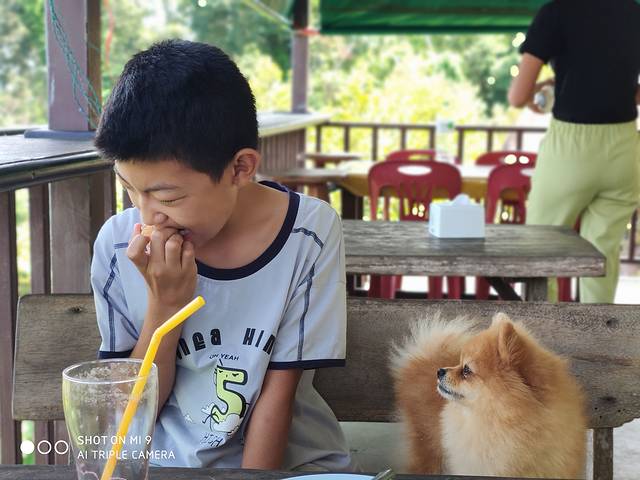 山顶餐厅有一只小狗,跟店主商量后把它抱到座位来陪我们吃饭。
