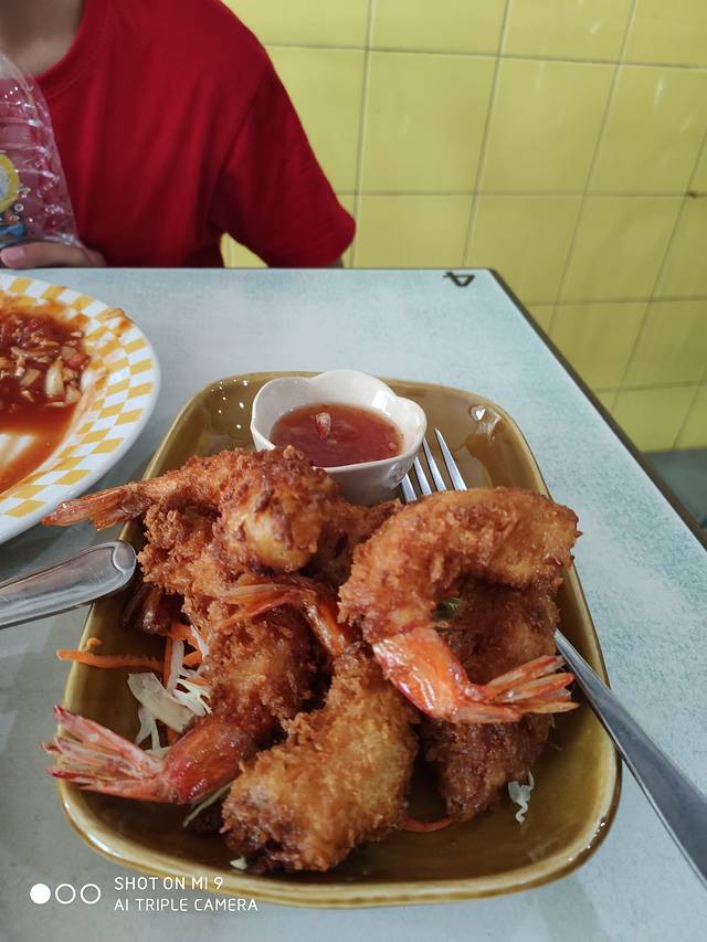 在火车站儿子可能因为中午的饭没怎么吃,要在车站吃个意面,而我也看到他们居然还卖炸虾,这个菜上次在象岛吃过很好吃。
