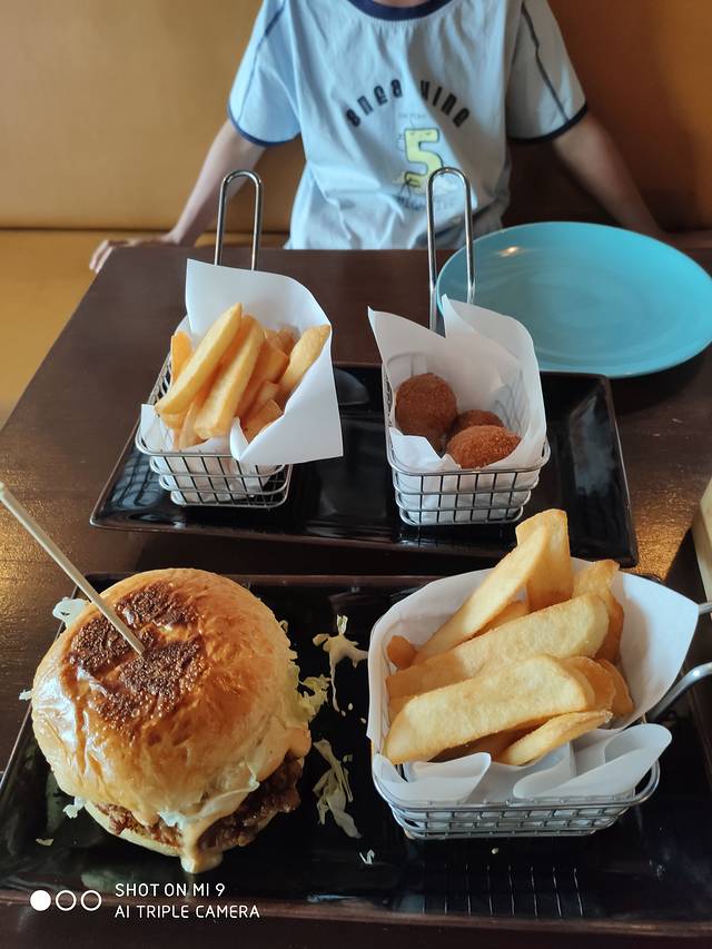 给大汉堡一个特写,肉饼巨大,这顿餐最后没有吃完。