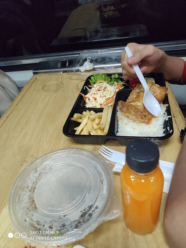 天还没黑,儿子又要吃饭,看着是要把一路吃的模式进行到底,火车餐可以点餐,服务员送餐到座位,猪排肉块很大,这一套190泰铢,有没有很超值的感觉。