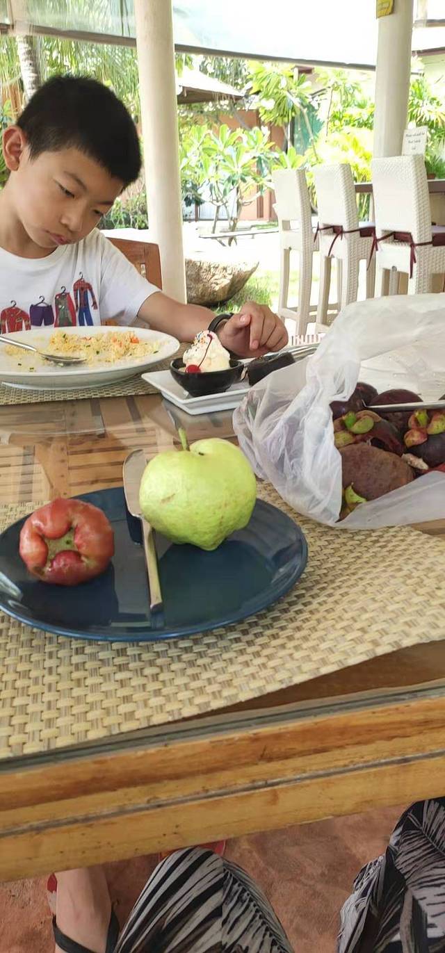 我出来陪儿子吃饭,在餐桌上吃我的水果,服务员还给我拿来了盘子和刀子。泰国的水果没有坑,个个都好吃。