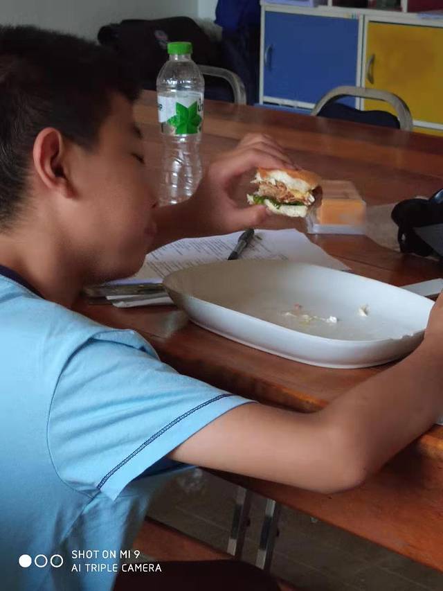 车一进学校门口,几个教练就过来迎接学生。我的教练先带我们熟悉了一下环境和各项注意事项(涛岛是个潜校岛,因为这个行业,这个岛也是个环保岛,后来我才知道岛上很少有一次性的物品)潜校的课程是老外做的,主题思想是让学生自学理论课程后自己做题,然后老师再讲解,我们在家把录像看了一半,还和商家联系说我们没看完,到了发现,我们还是要在学校再看一遍。教练讲了一点儿重点就出去了,告诉我们自学。第一次和儿子一起学习,还是挺新奇的,我们先做题再看录像,中间还在学校餐厅点了一个汉堡套餐,学校的餐厅居然是可以把餐送到教室里吃的,等你吃完人家再来收盘子,这服务太到位了。