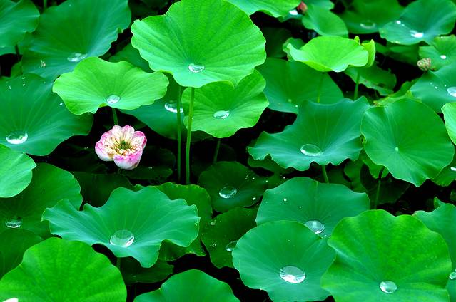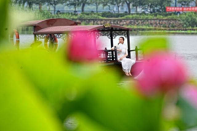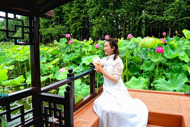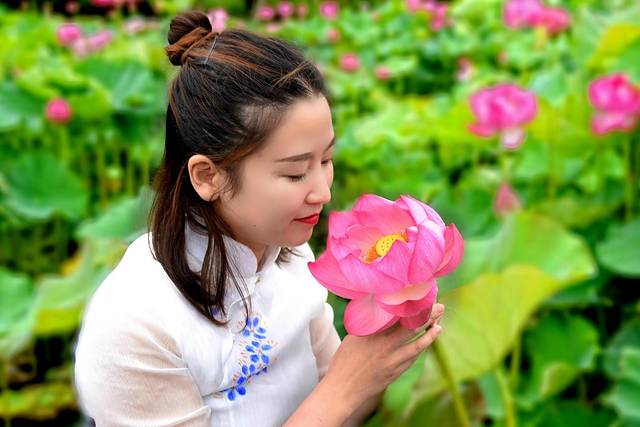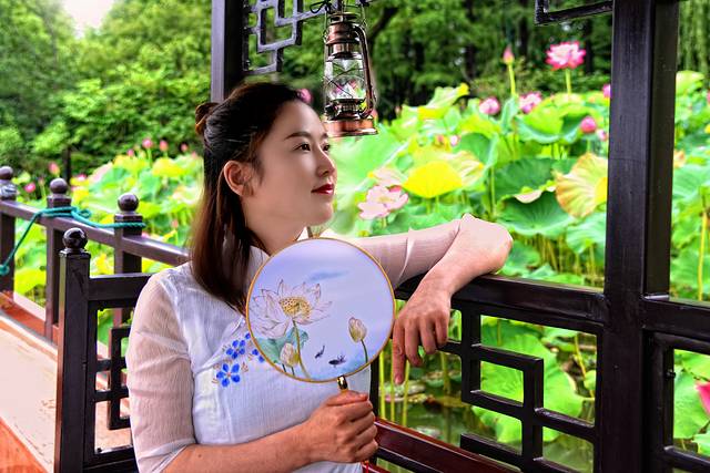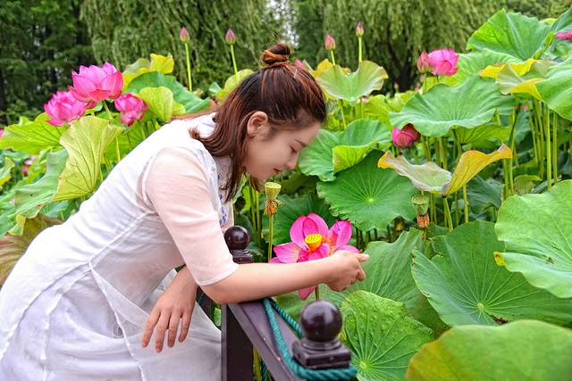 清代的石涛的《荷花》这样写道:“荷叶五寸荷花娇,贴波不碍画船摇;相到薰风四五月,也能遮却美人腰。”这诗句正是我们今日赏荷的写照:五寸的荷叶托着娇艳盛开的荷花,碧绿的荷叶密密的贴在水面,但这并不妨碍我们乘坐的彩舟在水面荡漾,夏季和暖的清风裹着飘着莲花的清香,眼下这些荷叶荷花的高度正好把美人的腰遮住。