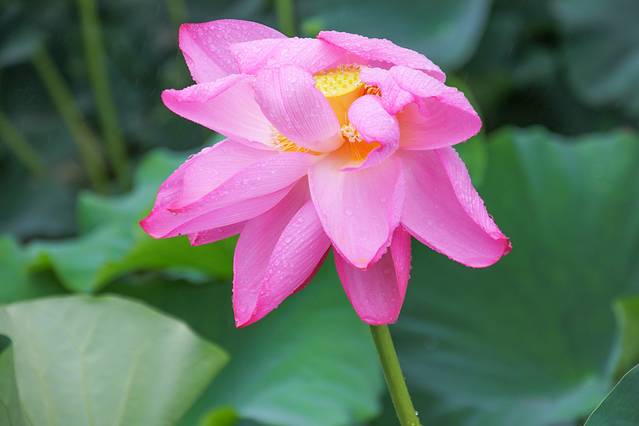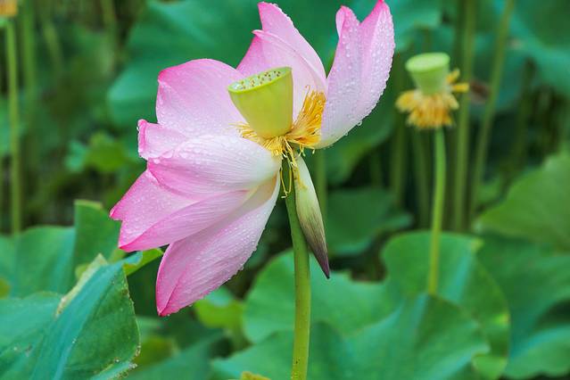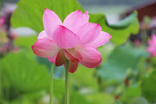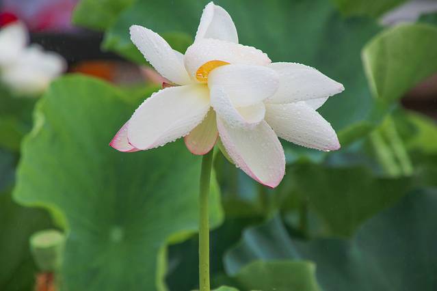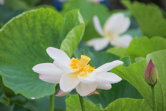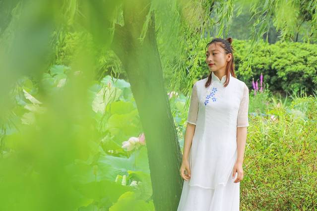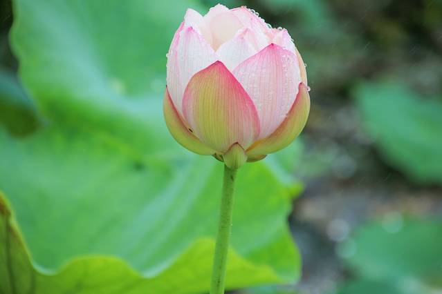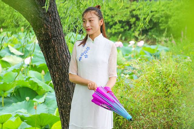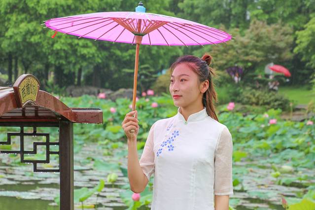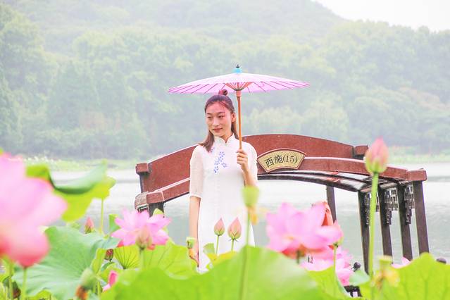 雨淅淅沥沥下个不停,可我却觉得江南这细绵绵的雨一点儿也不恼人,雨中赏荷倒多了几分趣味呢。雨水的气息、泥土的芬芳、荷花的清香,这几种味道糅合在一起,氤氲在江南六月的空气中。深深呼吸一口,顿觉心旷神怡。我们乘船进入荷塘,但见荷塘里或白或粉的荷花在风雨中昂首挺胸地站立着,宛如一位位骄傲的少女。立在荷尖儿上的蜻蜓早已不知所踪,不过谁也无暇去寻找它们的踪迹,毕竟,单是这娇媚可人的荷花就足以让我们挪不开眼睛了。