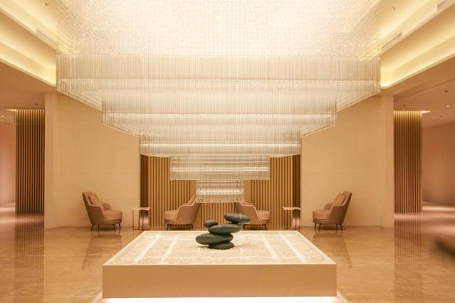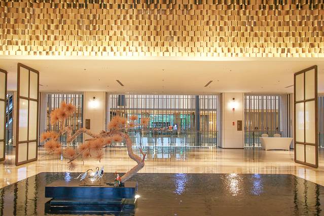 坐山拥水的鲁能万豪酒店,环境自然是舒适宜人。酒店外观为江南园林风格,内部也有很多园林元素,兼具美感和艺术感。