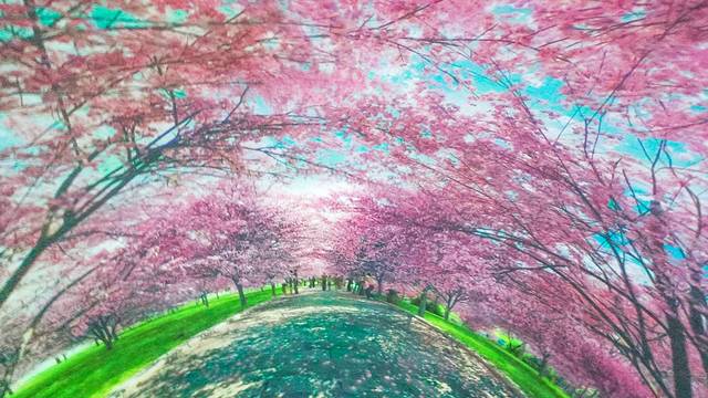 短短八分钟的时间内,鼋头渚春夏秋冬的美景依次在眼前呈现。最难以忘记的是影片中的鼋头渚樱花美景。我“穿梭”在樱花大道,空中漫天樱花飞舞,地上落英缤纷,刹那间,仿佛整个世界都变成了粉红色。我想伸手去触摸一朵樱花,我想嗅一嗅樱花的气息,我想在如雪如云的樱花树下跳一支舞……我沉醉了,醉倒在鼋头渚浪漫的樱花中。直到影片结束我还有种意犹未尽的感觉,内心不由得感叹,鼋头渚“中华第一赏樱胜地”的名号还真不是徒有虚名啊!