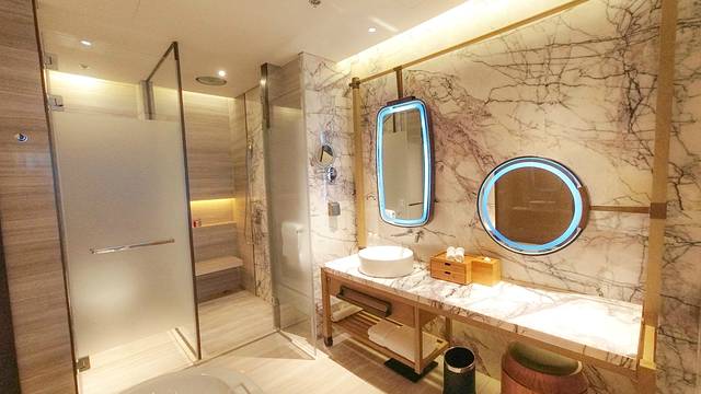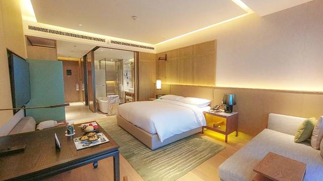 我入住的是总统套房。推开房门,房间典雅的装饰风格与江南水乡的细腻景致如出一辙。书桌上的果盘、糕点和欢迎信让我有种宾至如归的感觉。放下行李,我打量着房间的每一个小细节。不管是绿色橱柜里的迷你吧还是木质衣柜 ,不管是舒适的沙发还是干湿分离的洗漱间,亦或是全透明的落地窗,简约中流露着大气,低调而又不失奢华。