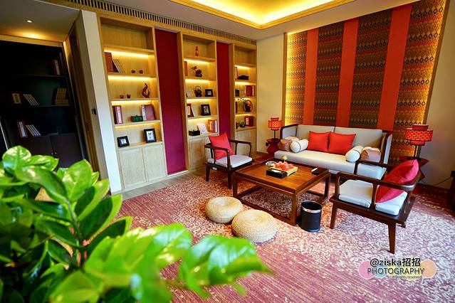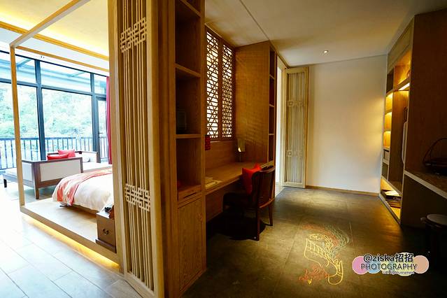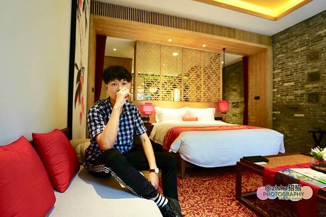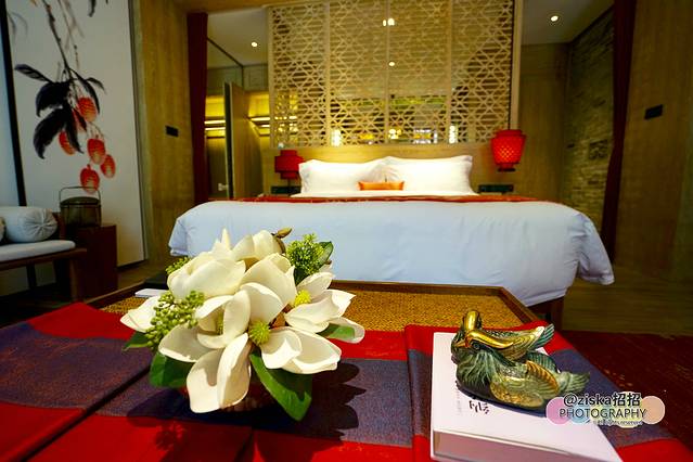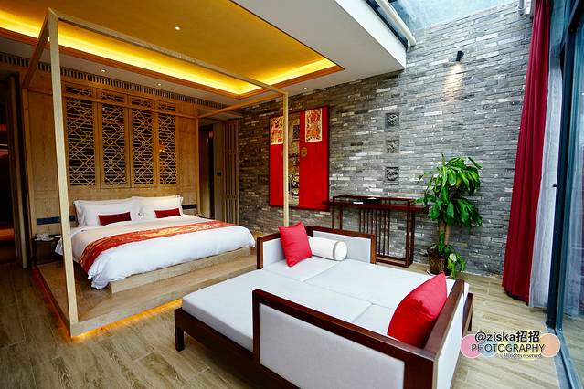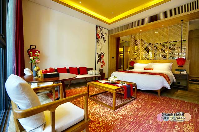 至尊套房采用现代客家风韵设计,配以红色装饰点缀喜庆氛围,简约时尚又不失客家文化底蕴。