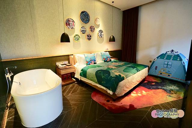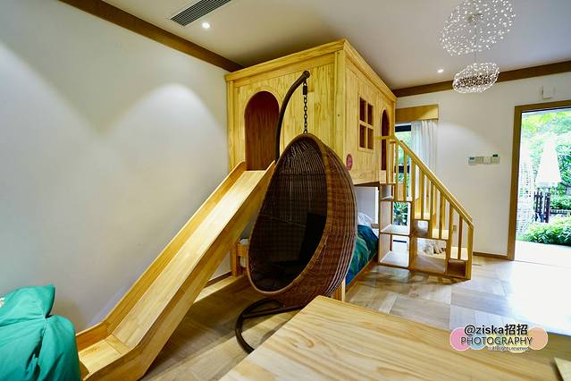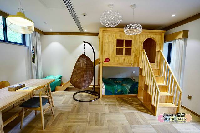 酒店设有标准房(设有榻榻米)、复式房(榻榻米+小阁楼)、套房(一室一厅+儿童滑梯床)和家庭套房(两室一厅+儿童滑梯)四种房型,共计47间客房。
