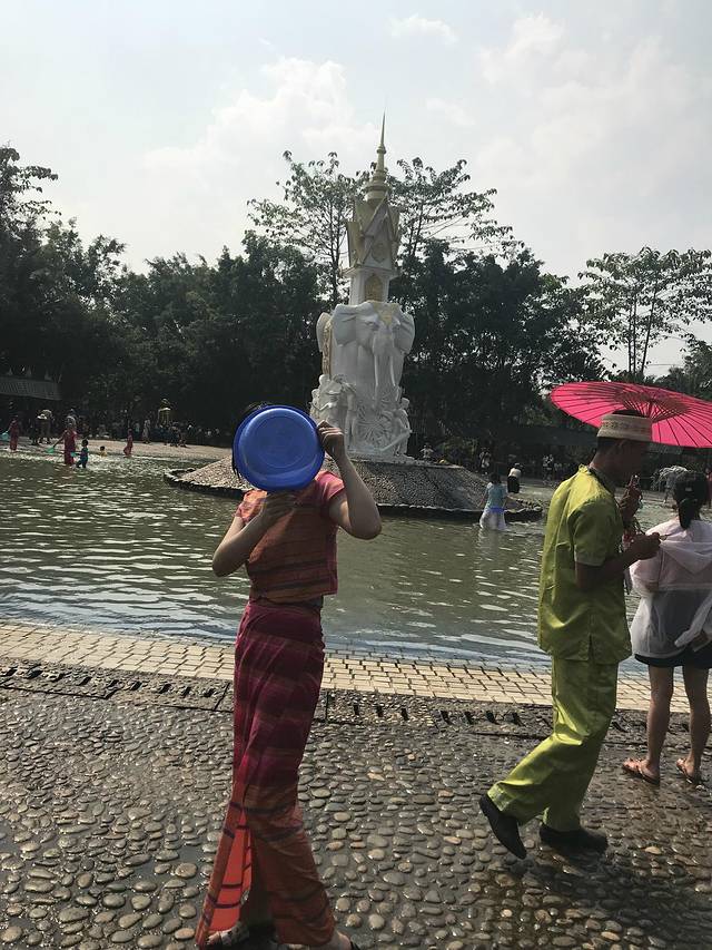 傣族园总体规划占地336公顷,主景区由曼将(篾套寨)、曼春满(花园寨)、曼乍(厨师寨)、曼嘎(赶集寨)、曼听(宫廷花园寨)五个保存最完好的傣族自然村寨组成,共有村民326户,1536人。主要游览点有景区大门楼、迎宾广场、江边活动区泼水广场、大型露天剧场 。根据旅游地图约两个小时就可以游览完。介绍说有民俗表演,但是转了一圈也没发现,泼水广场每天下午一点半和三点多两场表演,由园内工作人员带领游玩,需要租衣服40?租盆30?押金100?我们住在园子里里面穿了泳衣就只租了盆,场面热烈,大约泼水半小时,先是围绕泼水广场绕圈,最后进池子里大家泼水,来了就是要凑个热闹,参加完还是觉得挺有趣的。