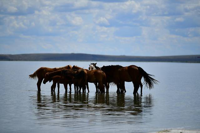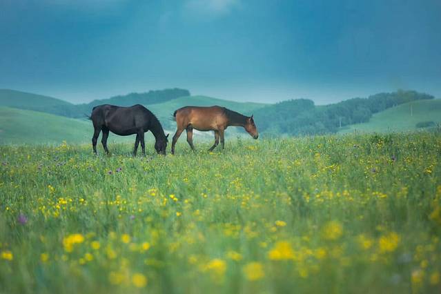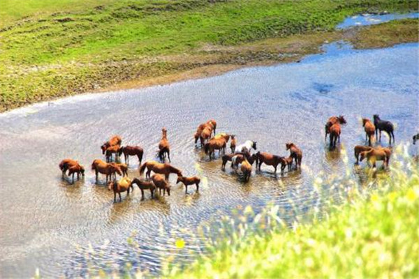放眼望去,眼前的一切都那么的详和,不仅满坡青草卧牛羊,还有成群结队的骏马,自由自在地散落在草地上、河道里,这里的一切都那么的和谐、自然!