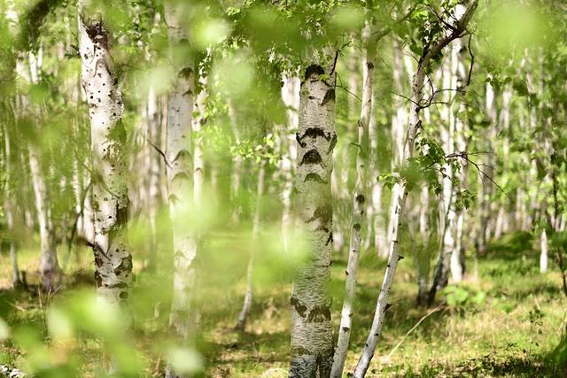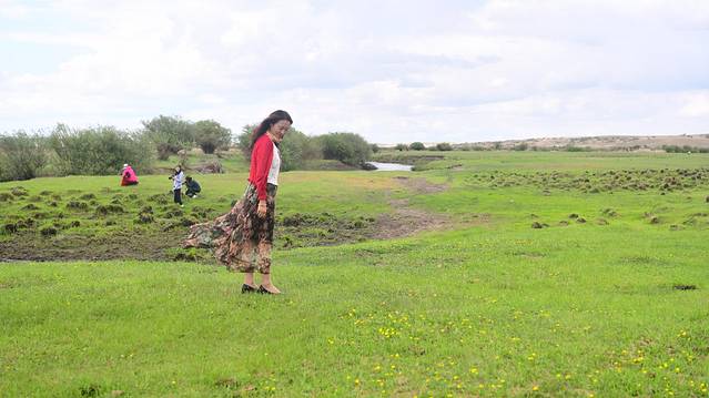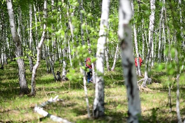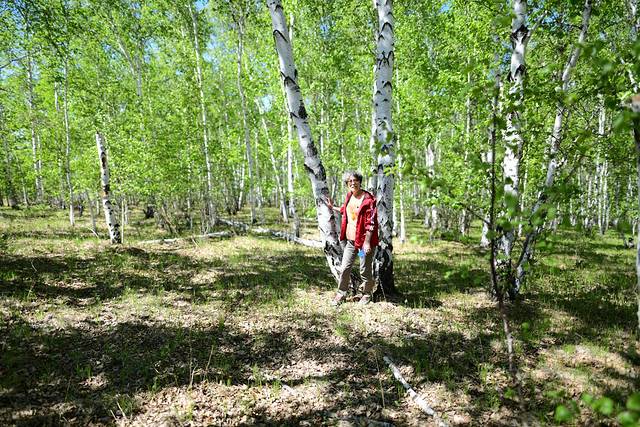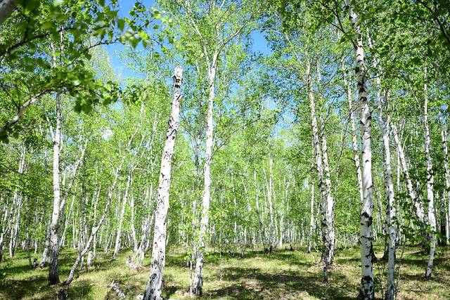 驱车继续前行,到达白桦林。白桦林在草原上随处可见,一阵风过,白桦树的枝叶就会被带起一阵响声,很像成片的海浪轻柔地拍打海岸的声音。