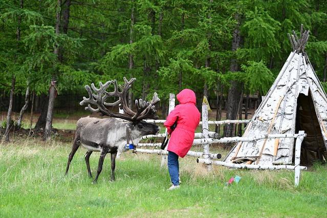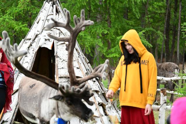 在鄂温克族喂驯鹿、逗奶牛,