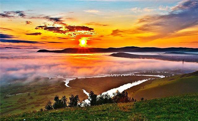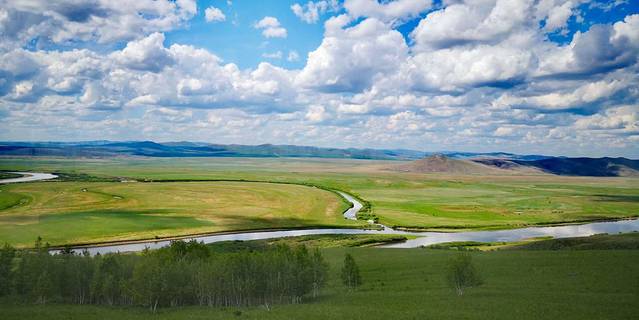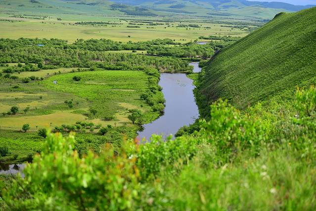 站在制高点,俯瞰莫日格勒河,就像长袖飘飘的仙女,在绿色绒毯上,伴着大自然的旋律舞动着唯美的身姿,蜿蜒、飘逸。