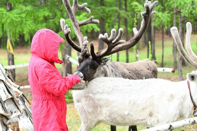 从莫尔道嘎出发,途径得尔布尔“兴安神鹿园”,近距离的与驯鹿、梅花鹿接触,给他们喂食苔藓,与它们亲密合影。