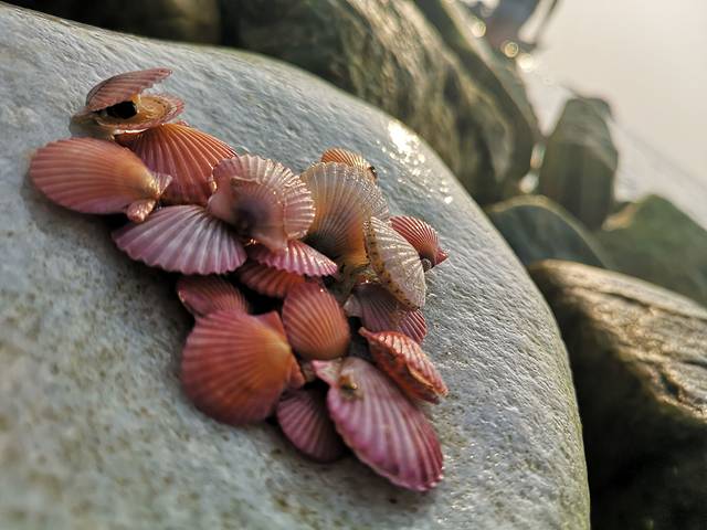 下午退朝的时候,海边就有很多很多赶海的人啦😄无意间发现了只有这里才有的粉色扇贝,地点在廊道那里下去海边后沿着往前走,就看到一个小码头,那里搭的有个棚子,粉色扇贝就在这里捡的