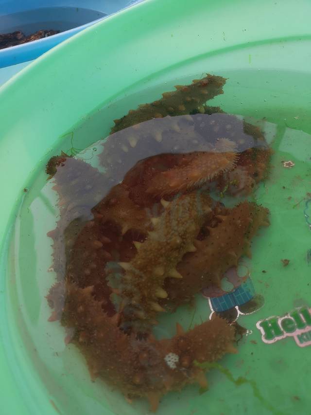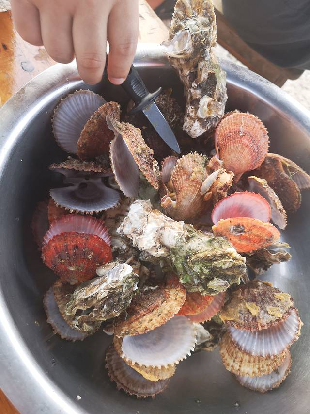 搭棚子的主人有条船,现去海里打捞的海参扇贝和生蚝,价格不贵,海参三十一只,生蚝扇贝六块一斤,加工费十元(水煮),这么一大盆总共四十元哦,吃了一饱顿,特别是孩子们