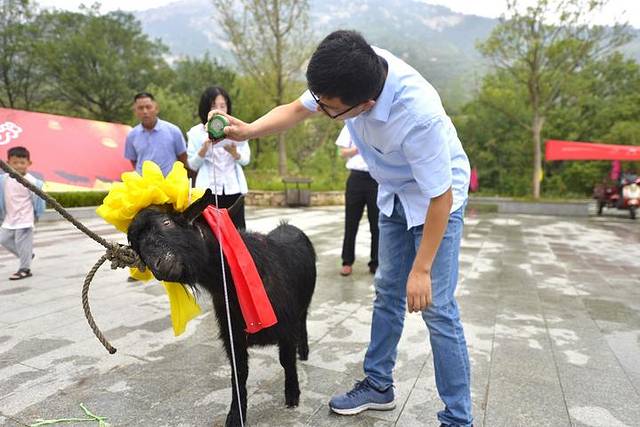 工作人员正在对山羊的身高、体长、体重进行测量,听说选出的山羊王可以奖励1万元!