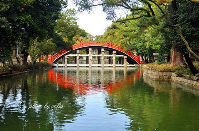 日本的神宫或是神社都有鸟居,它位于神社神路入口,以示神域之门。穿过鸟居,眼前便是一座朱红的小桥,学名“反桥”,即我们所说的拱桥,因其形如太鼓,也叫太鼓桥,如同彩虹般将人间与神界连接起来。