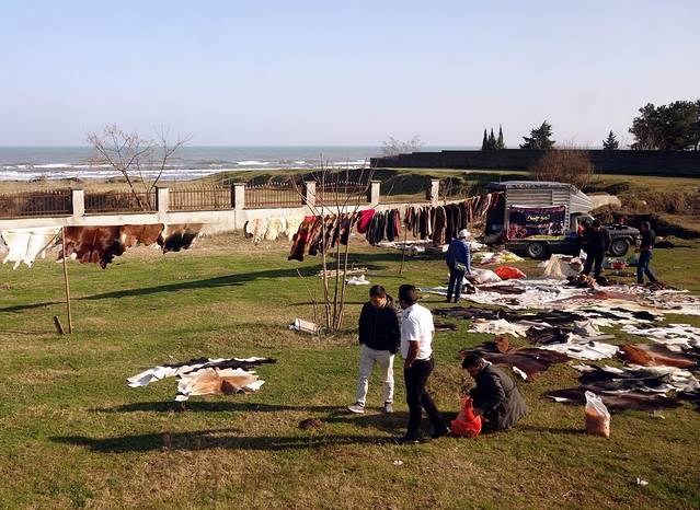 在里海旁边的一块空地上,有商贩在卖牛皮。一个团友想买,导游让司机停车,大家一块下去休息。