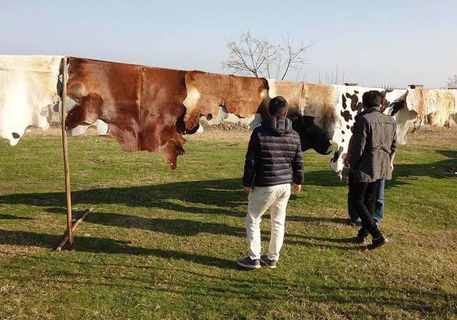 有的团友躺在牛皮上拍照。团友最后花600美元,买了两张牛皮。