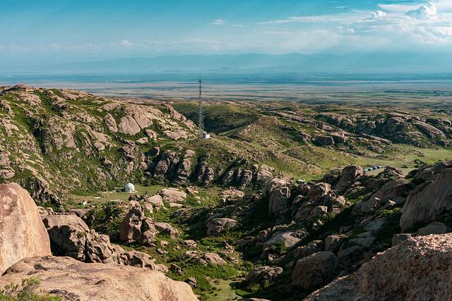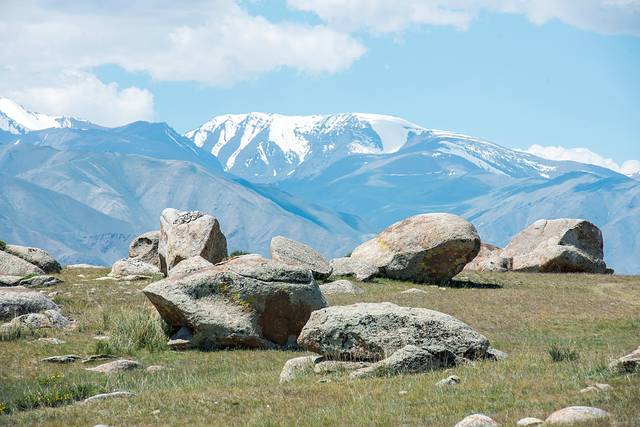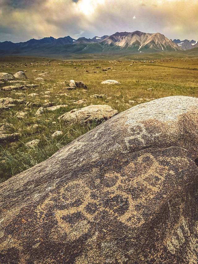 事实上,阿敦乔鲁在蒙语中的意思是马群一样的石头,描述的就是这种形态吧?它北倚阿拉套山,南傍温泉河谷,水草丰茂,是当地牧民的冬牧场。草场随处可见石堆圈和石板围成的方形石阵,星罗密布,形同迷宫,这便是阿敦乔鲁遗址古墓群。
