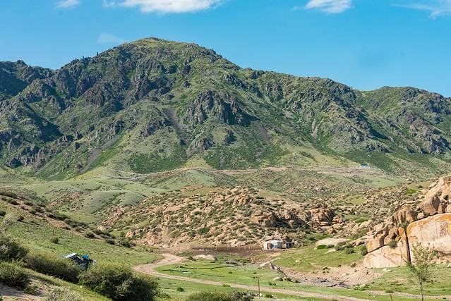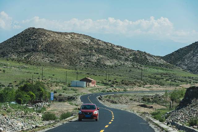 当地的朋友说要带我们去看一个大山里的咸水湖——闹干淖儿,蒙语的意思是蓝色的湖,而现在的人一般叫它小海子,它在精河县东南34公里处。开始的路还不错,虽然在修路但不影响通行。