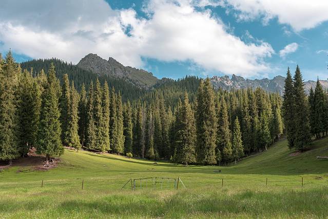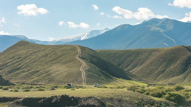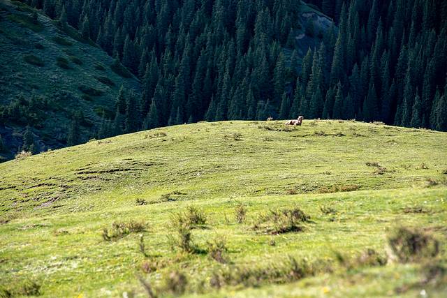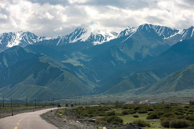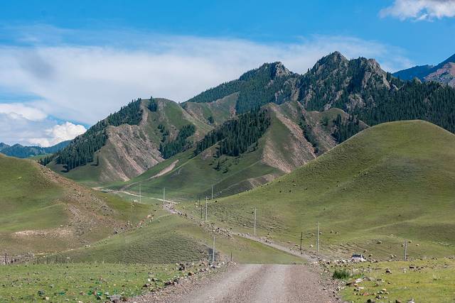 我们离开小海子,转去不远处的巴音阿门,这是天山腹地的一个高山牧场。路的前方一直通向积雪的高山,路的两边是连绵的绿色群山。