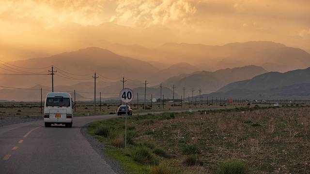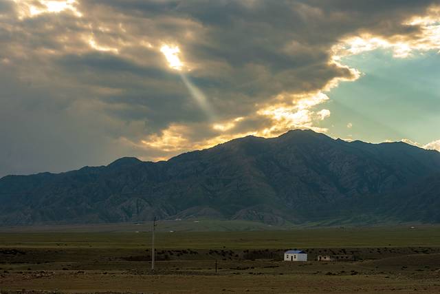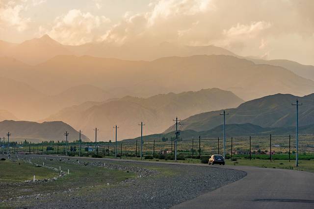开车行驶在开阔的旷野,日落前的金光温暖着大地。远山在逆光中显得如梦似幻,这不是仙境便是梦境。可它偏偏只是新疆日常的一景。