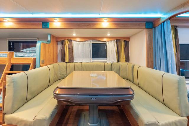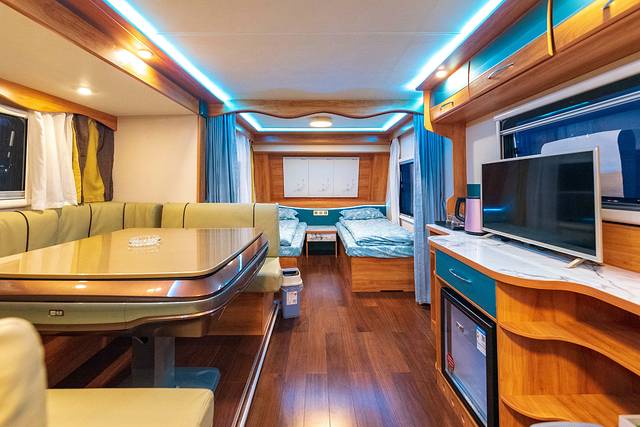 和洁白的外观形成对比的是,房车内部使用大量原木色的内饰,加上氛围灯,显得十分精致温馨。