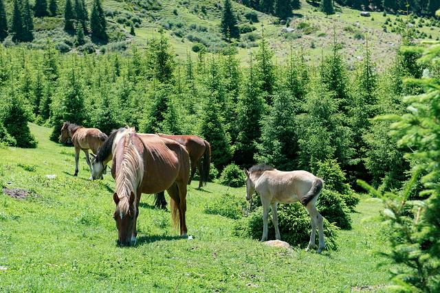 几匹马儿在山坡上低头吃着草,对于我们几个从身边经过的陌生人,根本不想抬头看一眼。