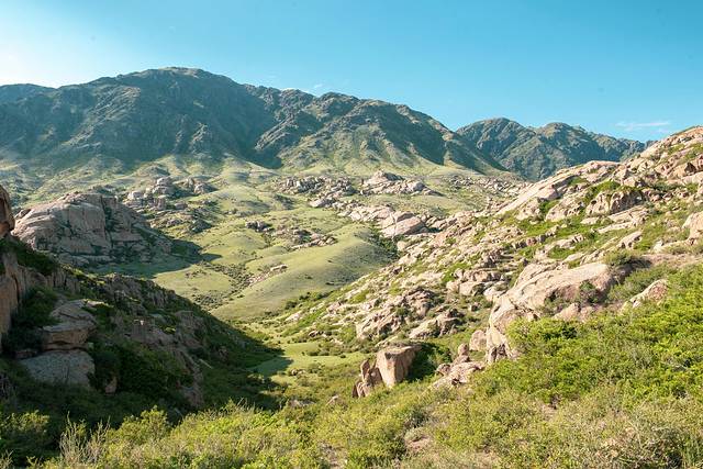 巴音阿门的绿意向我们扑来,那是一望无尽的丰饶,连绵起伏的群山像是刚换上了一件绿色的夏装,让我们这些干涸的眼睛一下子就滋润明亮起来。此时此刻,我想变成一株小草,在这片雨露滋润的山坡上疯长,然后在我的花期里,孕育一片盎然的生机。